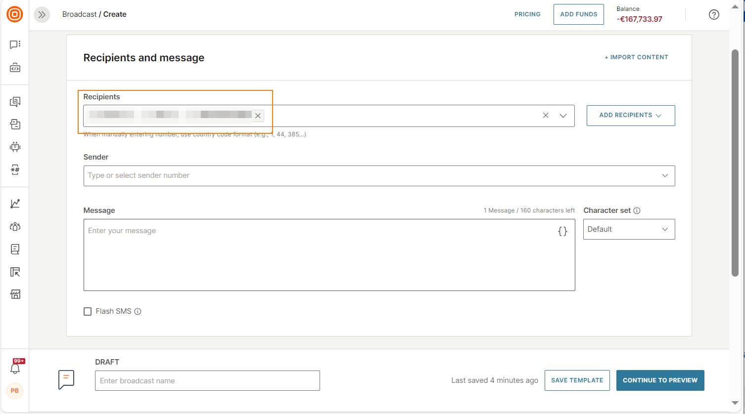 5. Select the channel through which you want you want to send the broadcast. Select the channel This directs you to Broadcast in the web interface, where you can create a new broadcast. The selected profiles are automatically added to the Recipients field. Configure the broadcast