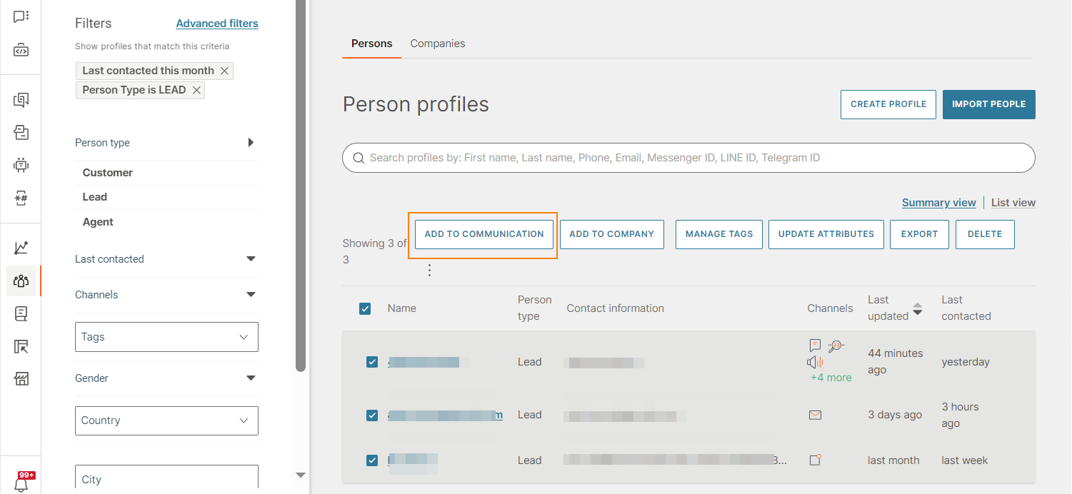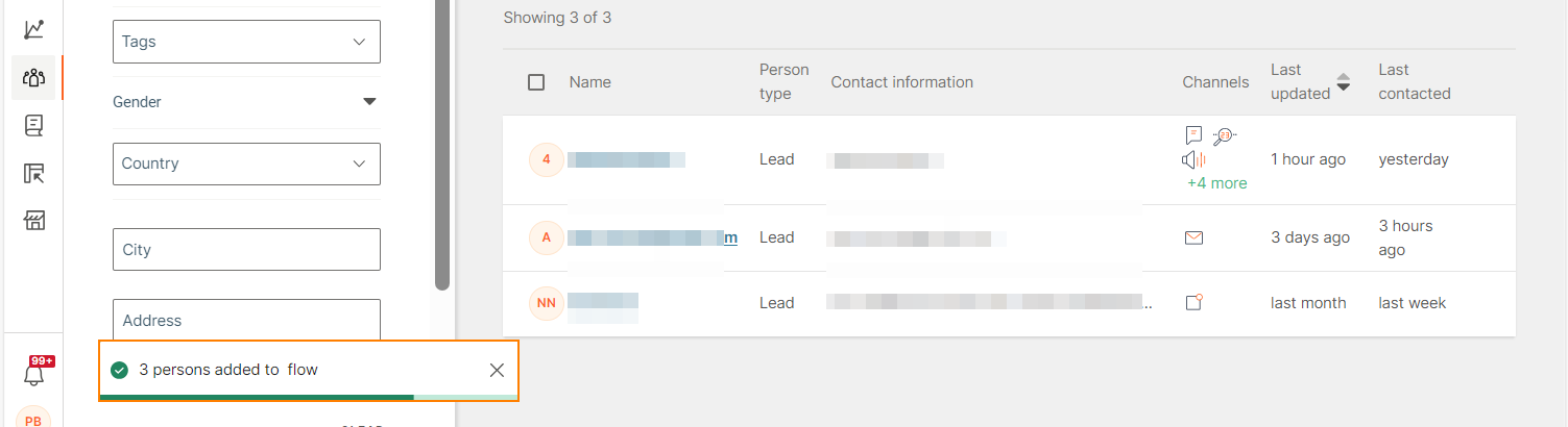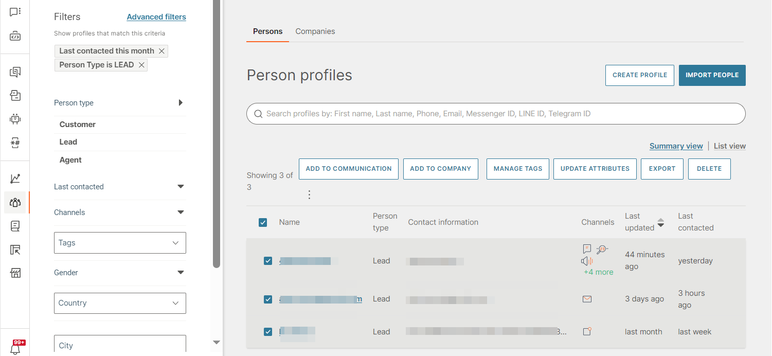 Filters are helpful when you want to see how many people were contacted within a specific time period and how many were reached over a certain channel. You can also use them to search for people by tags, gender, country, city, address, or combine these categories to perform an even more advanced search.