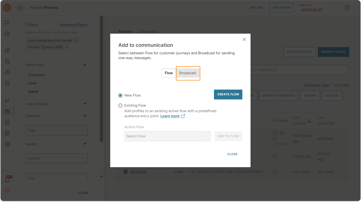 2. Use search and filter options to get the required list of profiles. Select the profiles that you want to add to a broadcast. Select the profiles