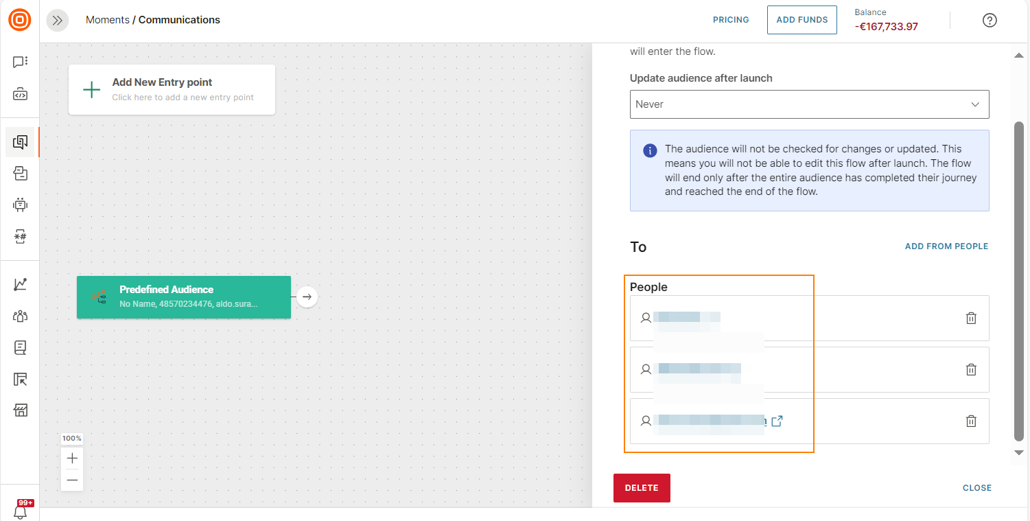 This directs you to the flow editor in Moments, where a new flow that has the Continuous entry point is created. The selected profiles are automatically added to the audience in this entry point.