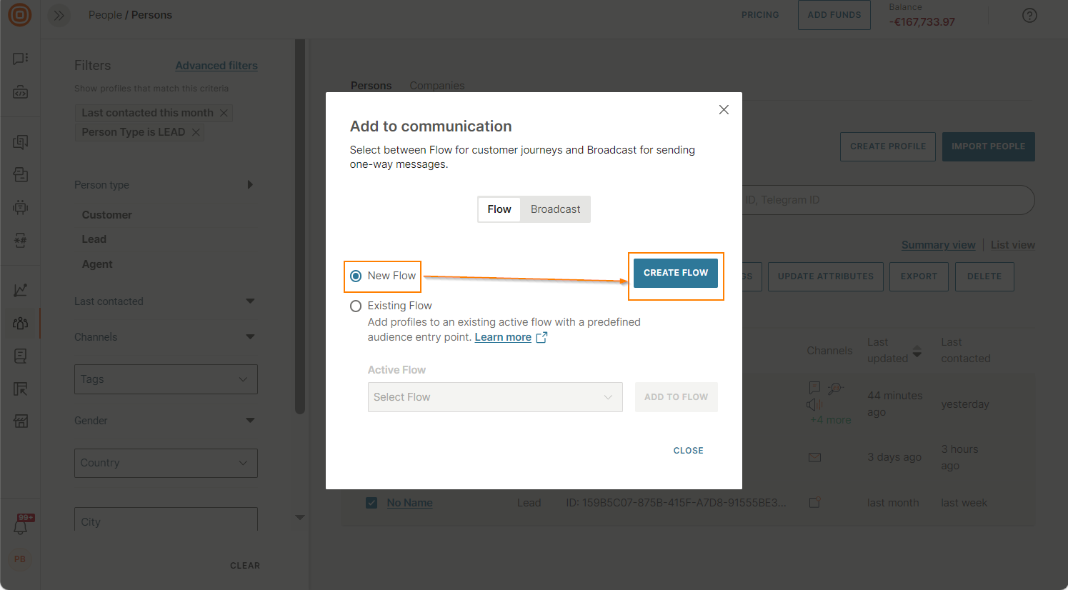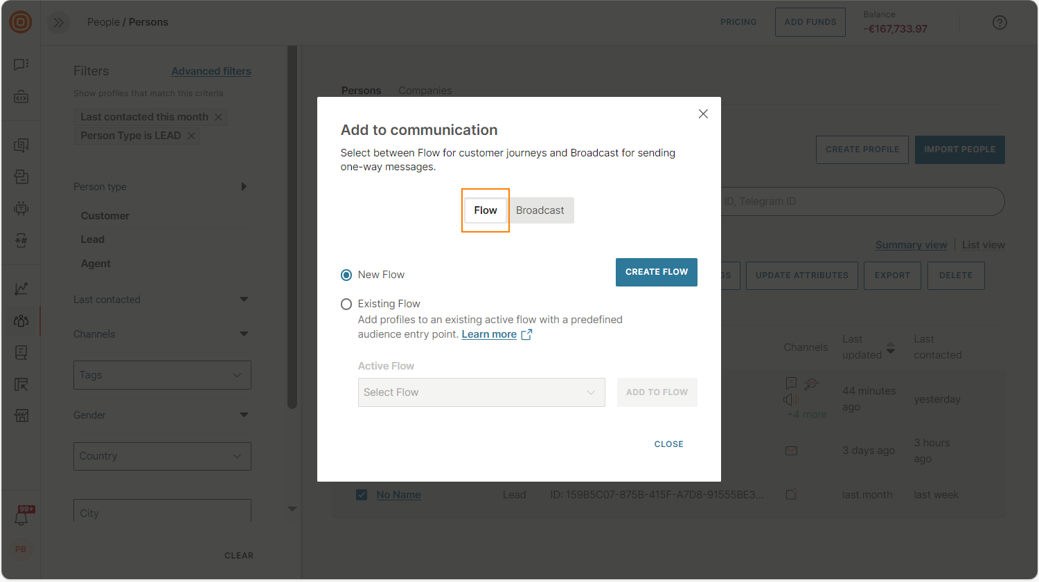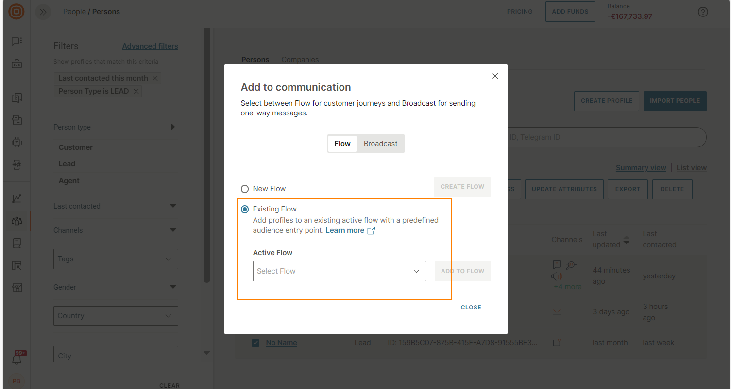 The following instructions show how to add profiles to a flow. Follow similar steps to add tags, segments, and companies to a flow.