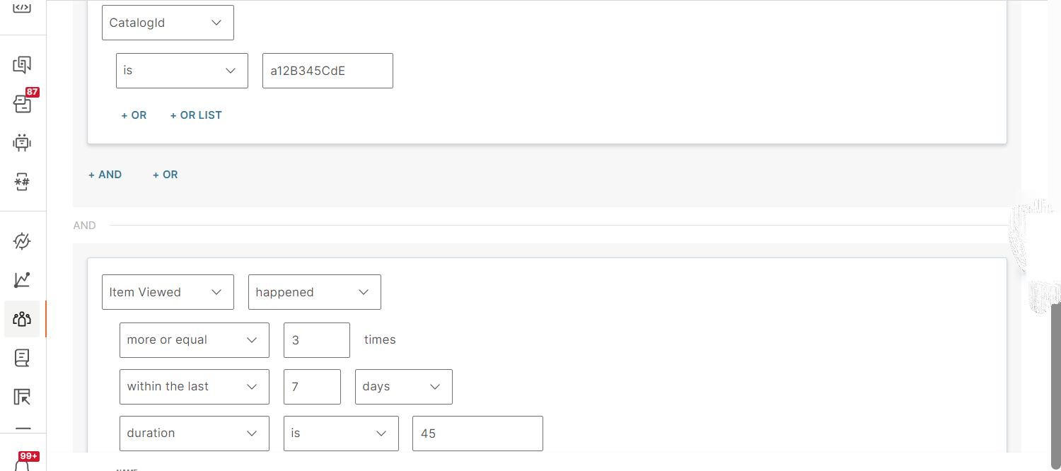If you use list attributes: You can control how the segment rules apply to list attributes. Refer to the Filter list items documentation.