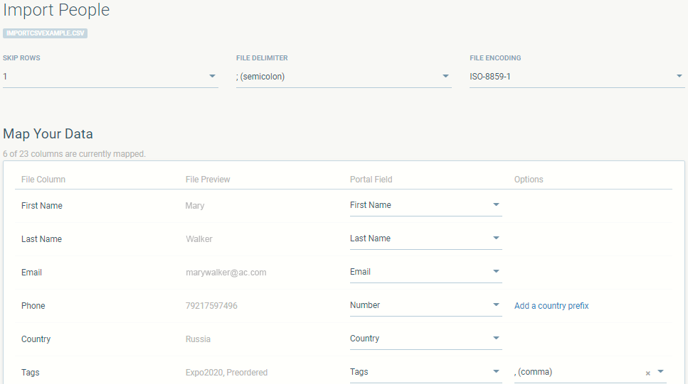 • To skip specific columns in the file, leave them unmapped. These columns are not imported.