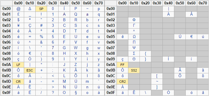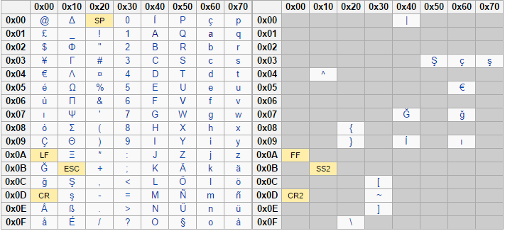 The GSM character set includes basic characters and extended characters. The following image shows the basic characters on the left and the extended on the right.