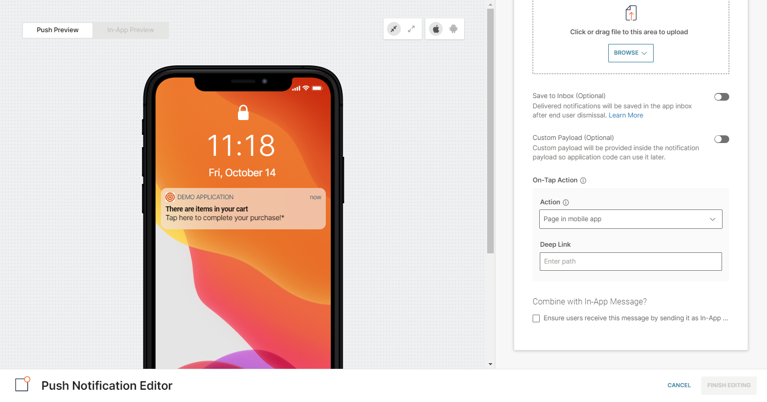 - To lead the end user to a specific page in your app such as the shopping cart, in the On-tap action section, do the following.