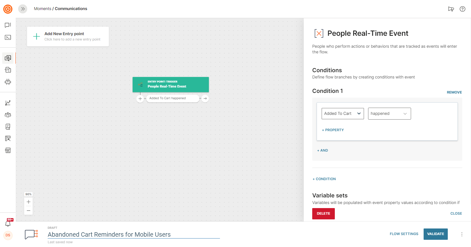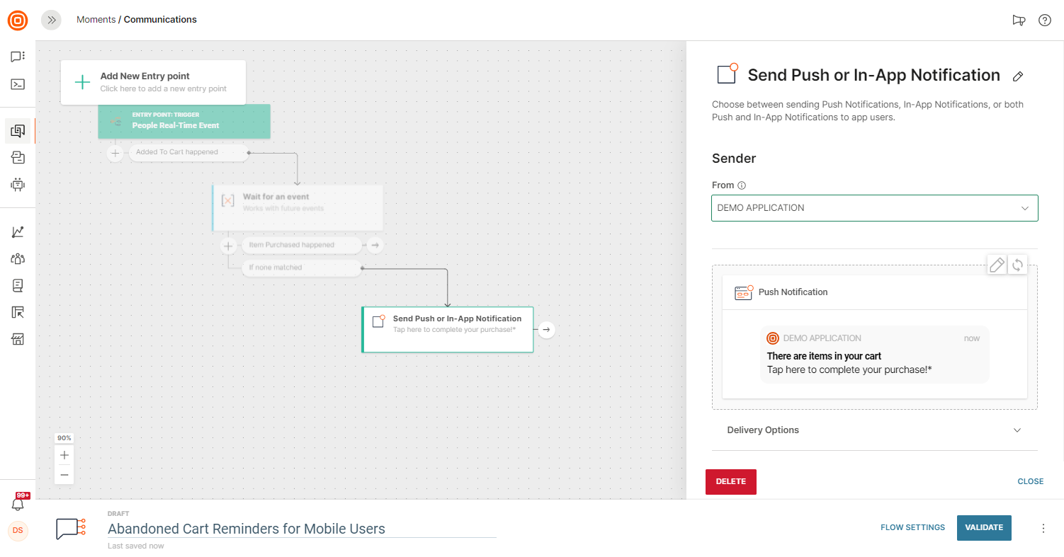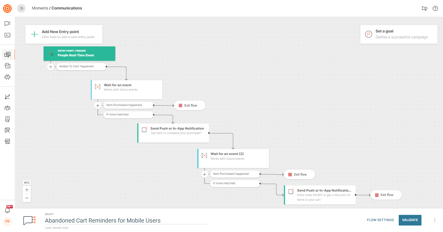 - A flow in Moments to send Mobile push notifications to end users. The flow described in this tutorial is also available as a template, Abandoned cart reminder for mobile users, in Moments. You can either set up this template for your application or create a flow from scratch.