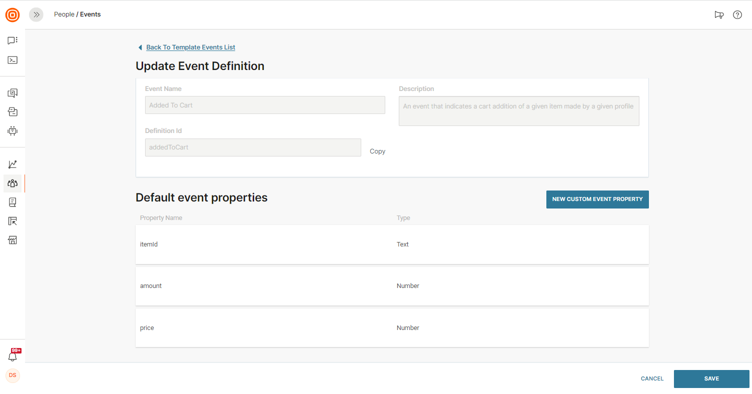 - Added to cart and Complete Purchase template events in People. Alternatively, you can create and use custom events.