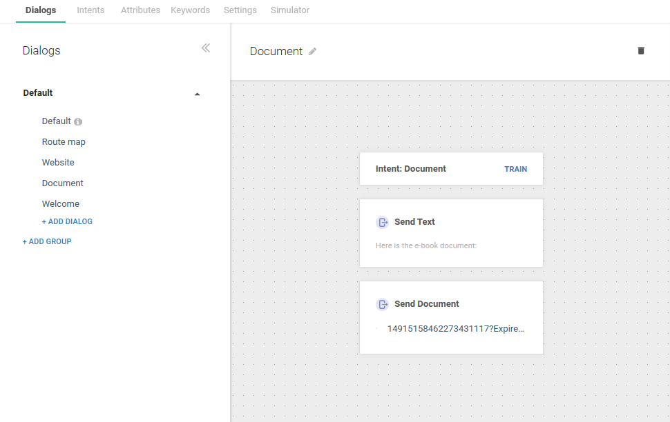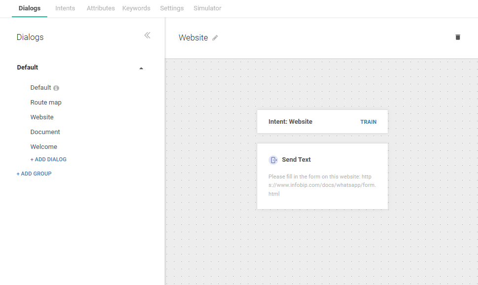 NOTEEnable NLP by checking the Enable the Intent Engine to process user input checkbox for cases where the end user sends a message that doesn’t correspond to expected keywords and the NLP engine will try to find the appropriate dialog and answer the user. You can also select the Fallback option for cases where keywords and NLP do not recognize the message and send the user directly to a dialog defined for such cases.