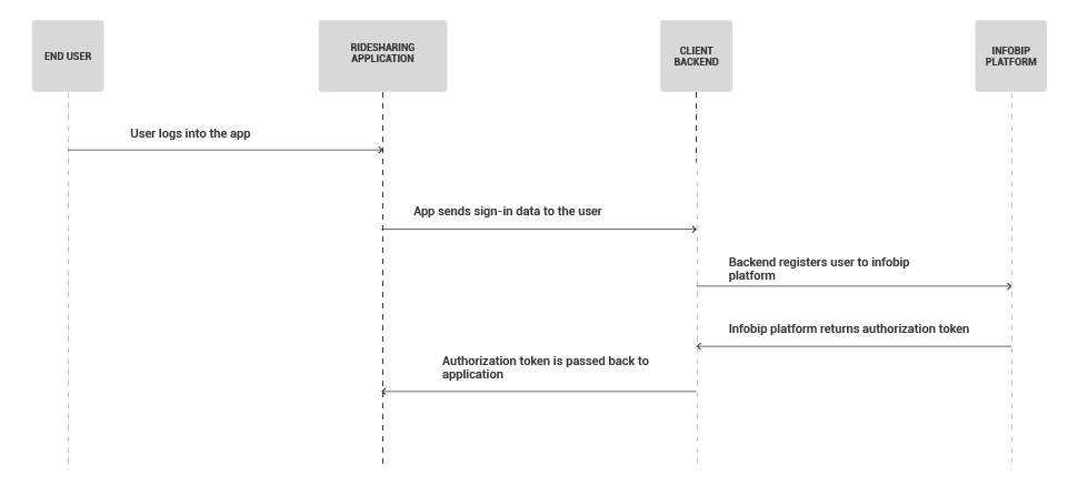 Register your users (opens in a new tab) on the Infobip platform over API. Users are registered with their identity – a unique alphanumeric string. Once completed, the Infobip platform will return an authorization token.