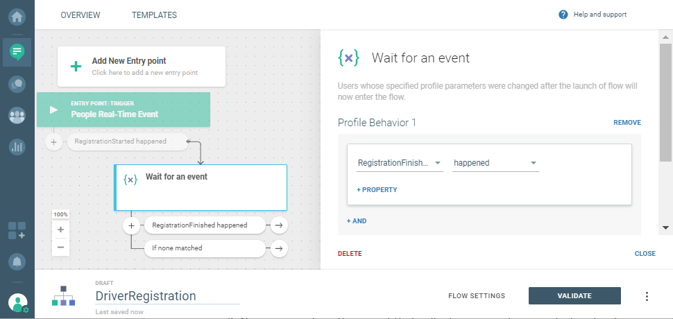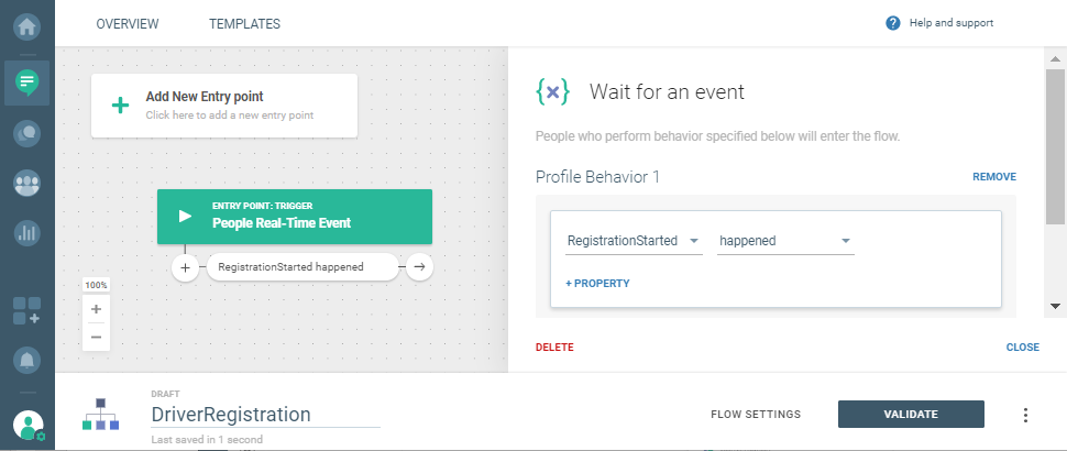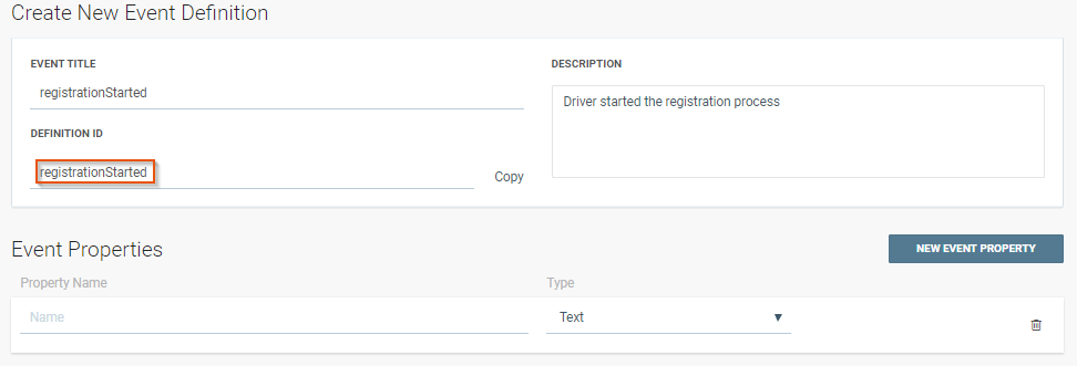 Before you start building the automated flow, go to the People (opens in a new tab) module on our web interface, and create the New Event Definition. In this case, you could use registrationStarted as an event that will trigger other actions in the communication flow. (You will need to do the same for every event you plan to add to your communication.)