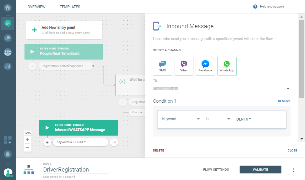 Use a WhatsApp entry point: Add New Entry point > Inbound Message. On the side panel, select WhatsApp and enter the keyword: IDENTIFY.