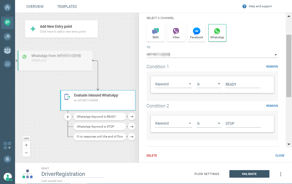 To continue the communication based on customer responses, go for Evaluate inbound WhatsApp message and create keywords READY and STOP for situations where the candidate is ready to continue or stop the registration.