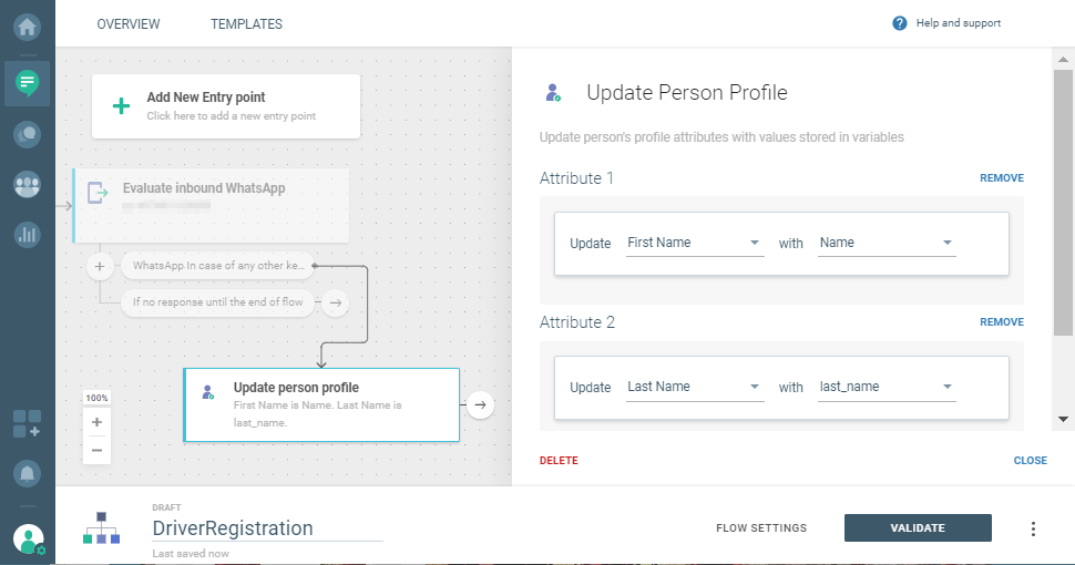 For drivers from the group b, who are ready to go ahead with the registration, include Evaluate inbound WhatsApp for both messages (one for first name response and the second one for the last name). This is what you need to do in the side panels: