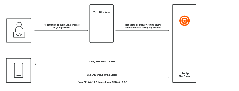 By referencing a message template ID (messageId) the Infobip system generates a PIN, places the PIN in the message template, and finally, sends the message with the PIN to the end user.
