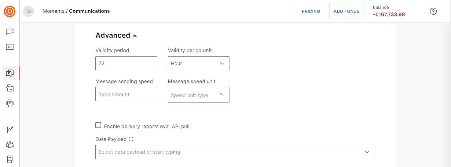 - Message sending speed: Specify the rate at which messages are sent, choosing the number of messages to be delivered per second, minute, hour, or day.