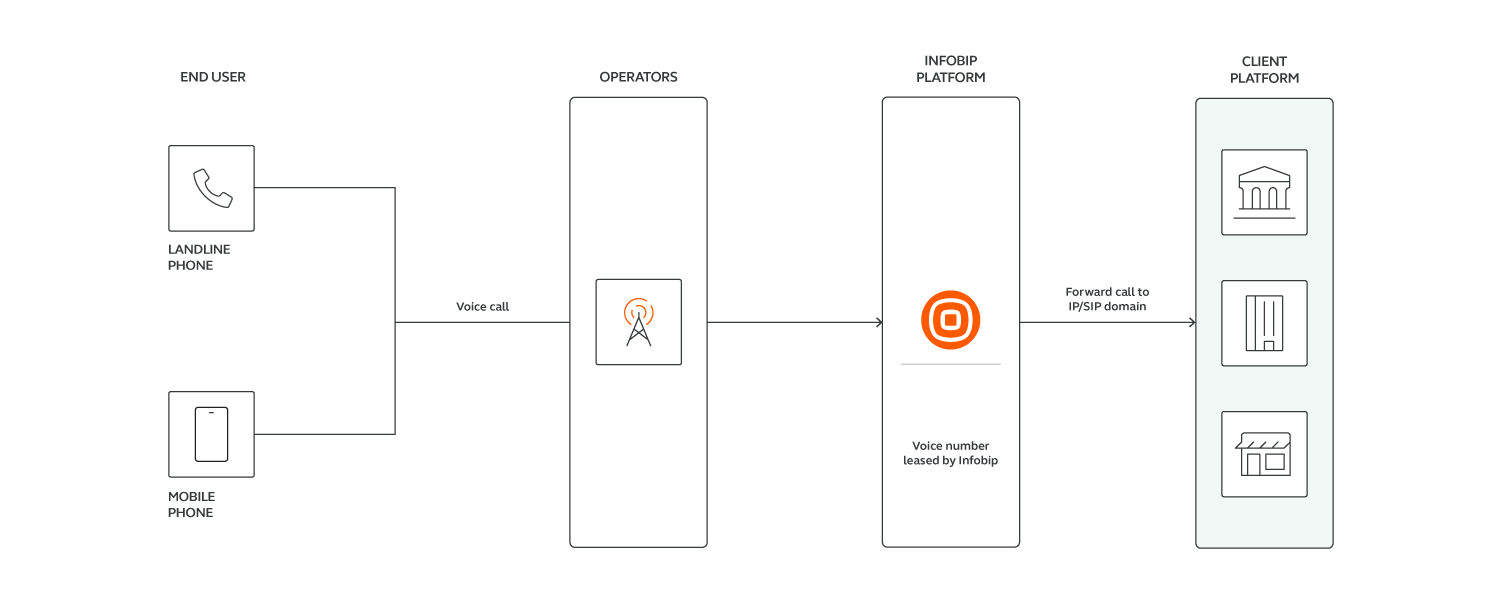 Voice numbers are phone numbers that can receive incoming calls on the Infobip platform.