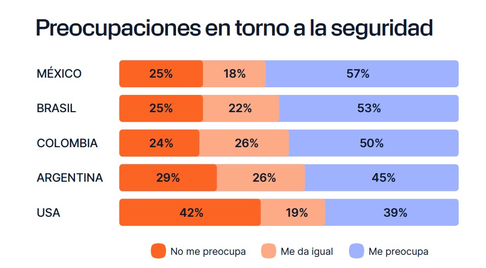 Aunque los bots han avanzado en capacidad, la confianza sigue siendo un reto. Según nuestros datos obtenidos, solo el 44% de los usuarios en Brasil y el 42% en EE. UU. confían plenamente en la información que reciben a través de estos sistemas. En varios países, la percepción de riesgo ronda el 50%.