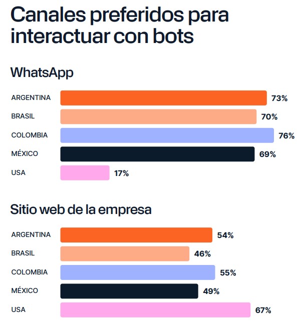 En Argentina y Colombia, casi el 90% de las personas encuestadas afirmó haber interactuado con un chatbot. En Brasil y Estados Unidos, ese número baja a 71% y 68%, respectivamente. Esta alta penetración refleja una realidad innegable: los chatbots ya forman parte del recorrido del cliente en América.