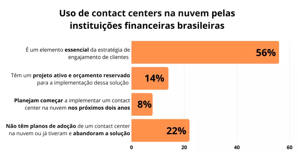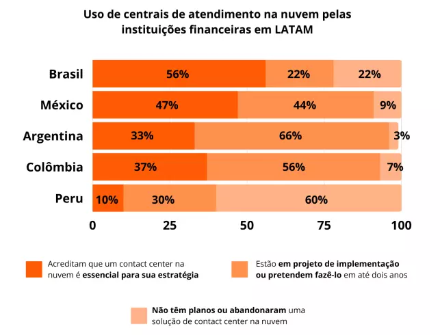 No estudo, ficou demonstrado que 56% das instituições finaneiras brasileiras já aderiram a um contact center na nuvem e acreditam que essa solução é essencial para a sua estratégia de engajamento dos clientes. Esse número é o maior da América Latina que, em média, tem 44% das instituições financeiras achando o mesmo. O México é o segundo país com mais instituições engajadas neste projeto, com 47% acreditando que eles são parte essencial da sua estratégia. Já no Peru, apenas 10% das instituições concordam com essa afirmação.