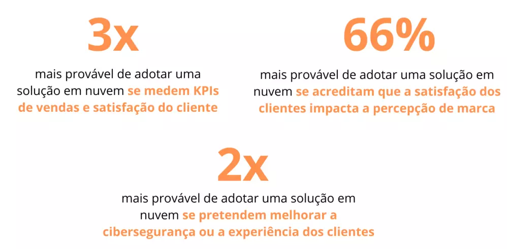 No estudo também foi possível estabelecer a estreita ligação que existe entre as métricas de sucesso que os provedores financeiros estão medindo e incorporando às suas estratégias e as suas adoção de soluções em nuvem. Pelos dados mostrados, é muito mais provável que as instituições financeiras que medem métricas essenciais (como satisfação do cliente, atração e retenção) acabem optando por uma solução em nuvem.