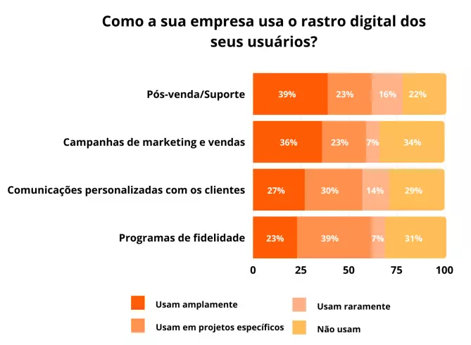 Mas também segundo a pesquisa, o uso não é tão abrangente quanto poderia ser dentro das empresas. Por exemplo: apenas 27% dos varejistas brasileiros usam esses dados amplamente para criar comunicações personalizadas, enquanto 29% não usam para esse fim ou não tem a pretensão de usar.