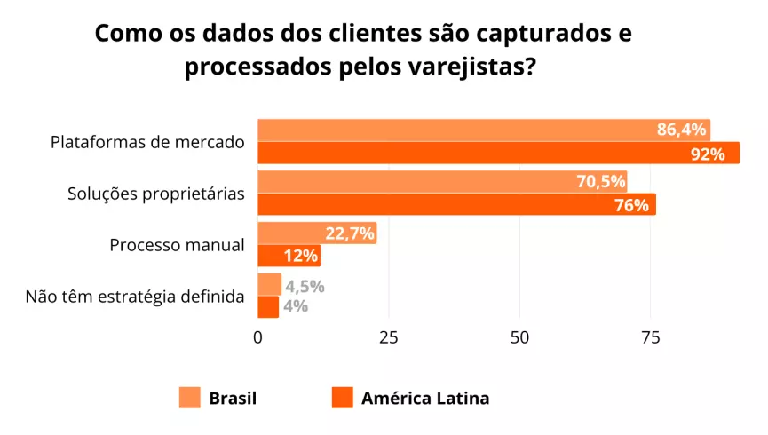 Diante disso, a IDC investigou um pouco mais a fundo sobre os métodos de processamento de dados utilizados pelos varejistas hoje, bem como os ambientes digitais onde ocorrem esses processamentos de dados. Com isso, foi possível verificar que 86,4% das empresas processam alguma parte do rastro digital de seus usuários por meio de plataformas de mercado para gestão de dados e comunicação com o cliente. Além disso, 70,5% dos varejistas tem alguma solução proprietária rodando sozinha ou em paralelo para fazer esse processamento.