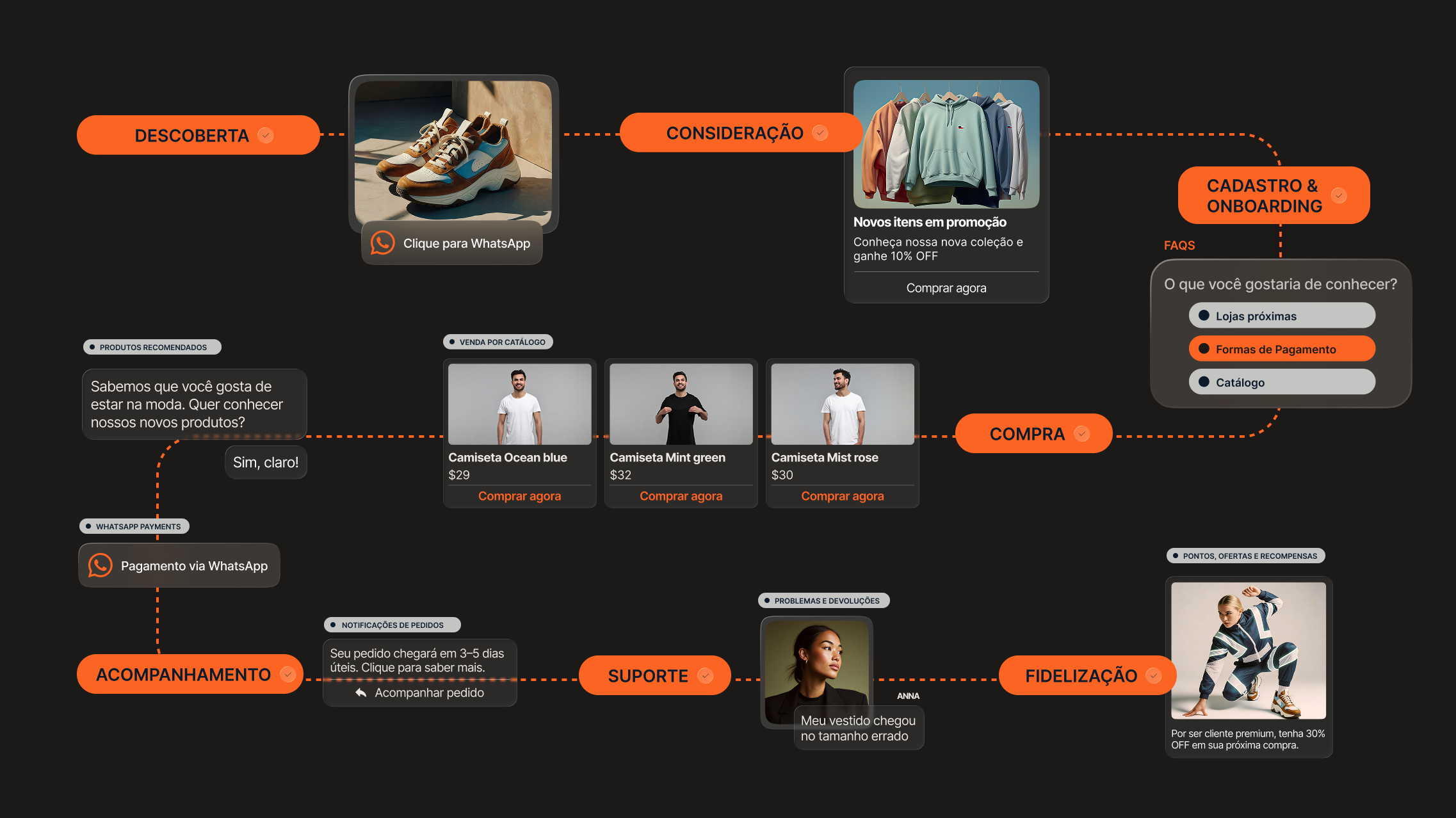 Descubra como criar jornadas completas de compra no WhatsApp Business, sem que o cliente precise sair do chat. Do primeiro contato até o “obrigado pela sua compra”.