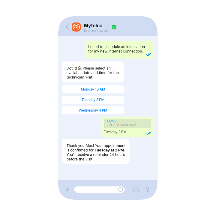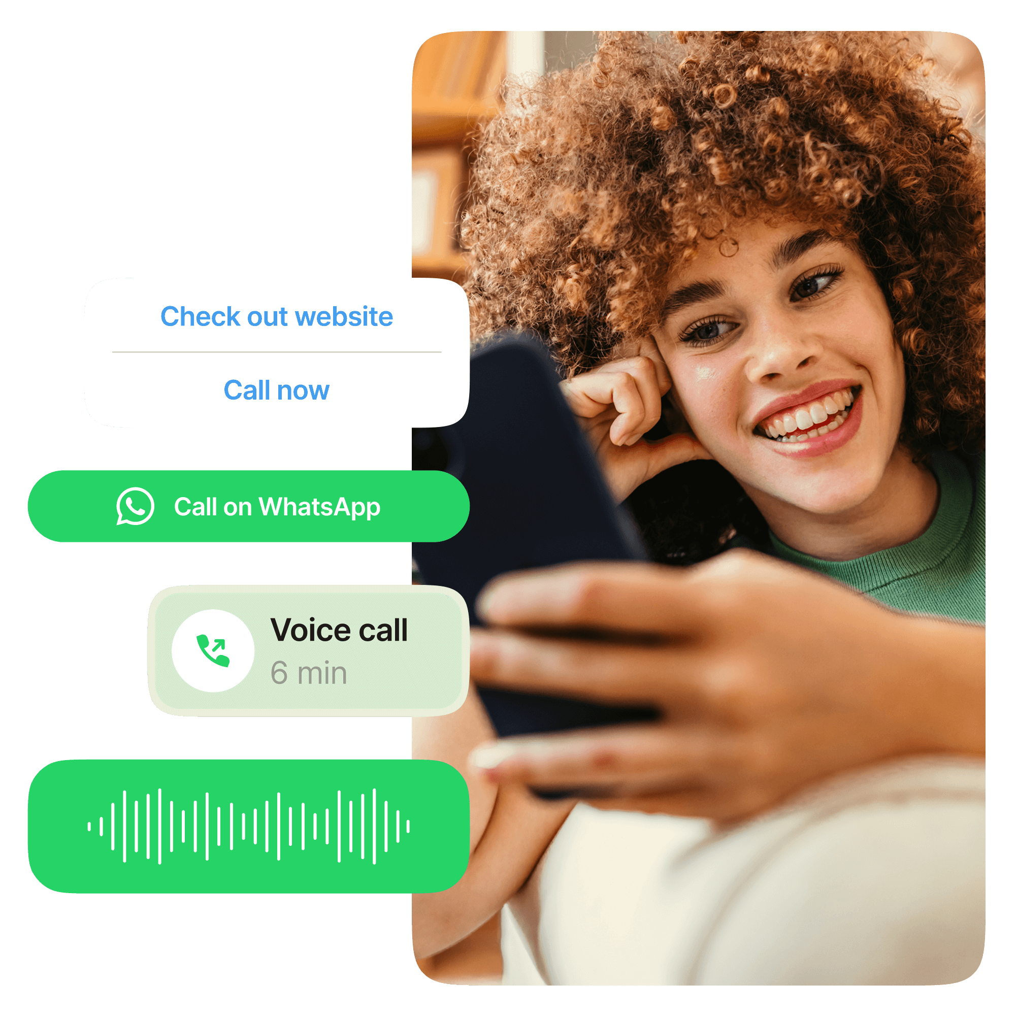 Add voice calling capabilities to your WhatsApp Business messages with Infobip’s secure, scalable API. Leverage voice to resolve issues faster and drive conversions – all in one channel.